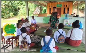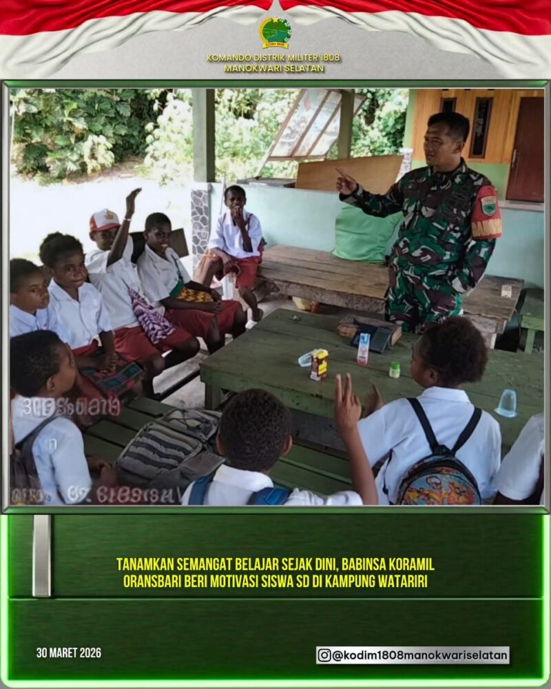 ORANSBARI || indonesianewstoday.com – Dalam rangka melaksanakan pembinaan teritorial sekaligus mempererat hubungan dengan masyarakat, Babinsa Koramil 1808-02/Oransbari turun langsung menyapa anak-anak di Kampung Watariri, Distrik Oransbari, Senin (30/3/2026).