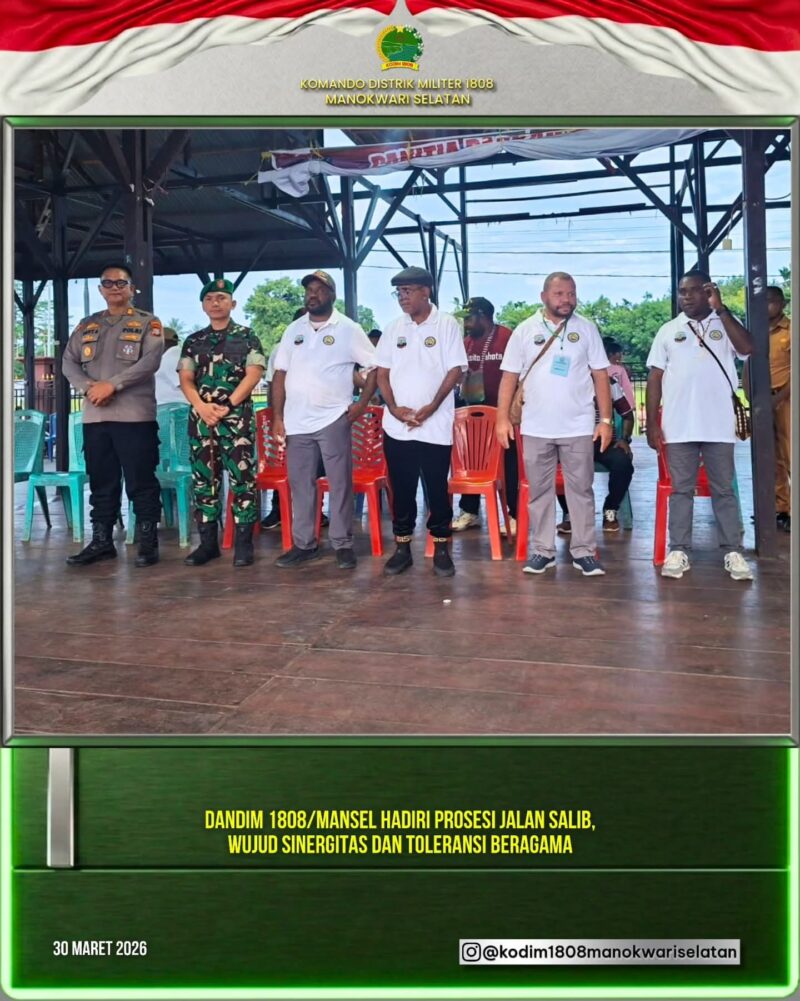 RANSIKI || Indonesianewstoday.com || 31 – Maret – 2026, – Komandan Kodim 1808/Manokwari Selatan, Letkol Czi Sunandar Parius Sudarmono, S.E., M.I.P., M.M., menghadiri prosesi ibadah Jalan Salib yang diikuti umat Nasrani di Kabupaten Manokwari Selatan, Senin (30/3/2026).