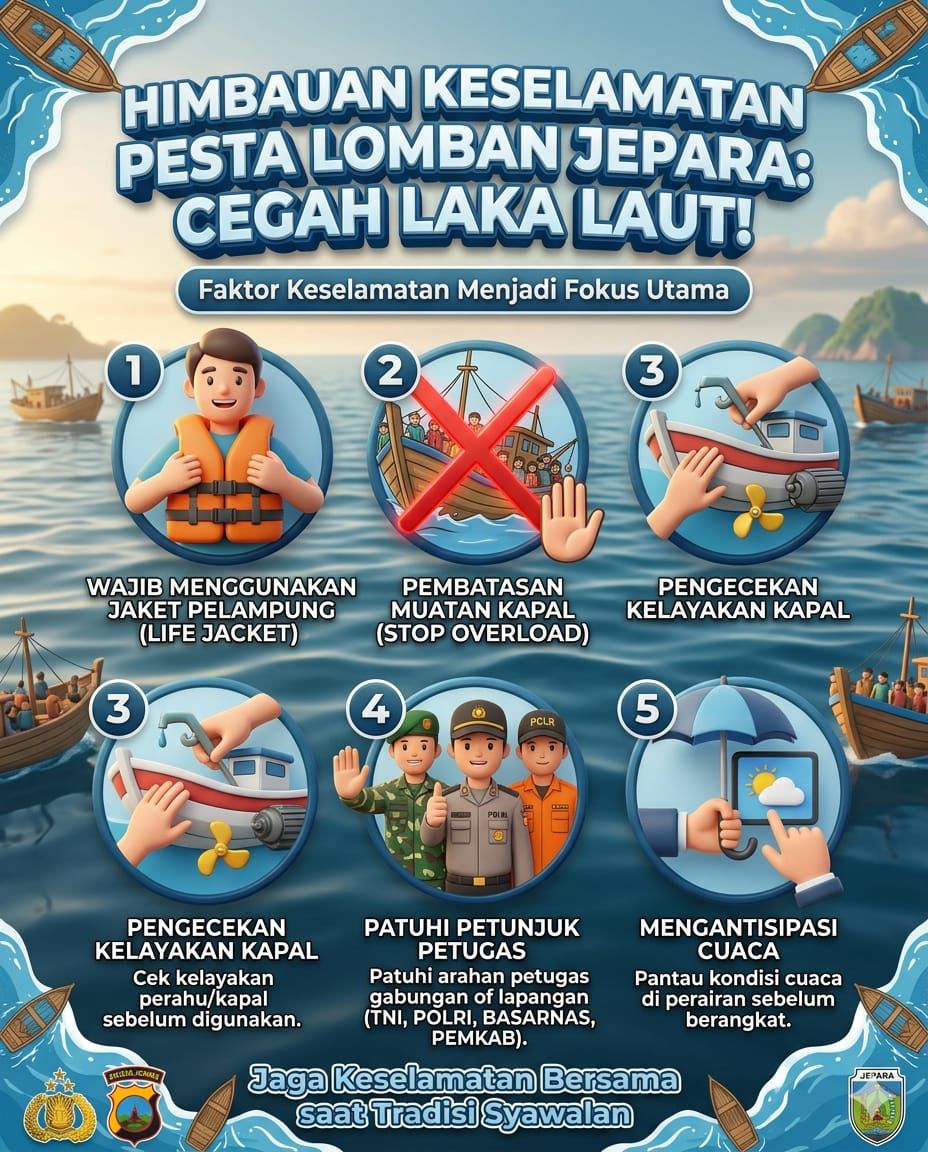 Jepara || indonesianewstoday.com || 27 – Maret – 2026, – Polres Jepara mengimbau masyarakat yang akan mengikuti tradisi lomban kupatan di Pantai Teluk Awur, Kabupaten Jepara, Jawa Tengah, untuk mengutamakan keselamatan, khususnya dengan menggunakan jaket pelampung (life jacket) saat beraktivitas di laut.
