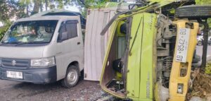 Namun, manuver darurat tersebut membuat truk menabrak pohon dan beton di sisi kiri jalan. Benturan keras menyebabkan truk terguling ke arah kanan dan menimpa mobil pick up yang berada di dekatnya.