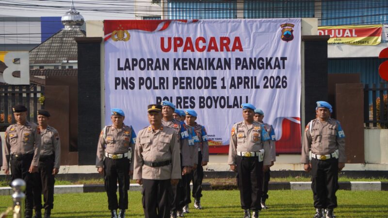 Boyolali || indonesianewstoday.com — Polres Boyolali menggelar Upacara Laporan Kenaikan Pangkat PNS Polri periode 1 April 2026 yang berlangsung khidmat di halaman Mapolres Boyolali, Selasa (7/4/2026).